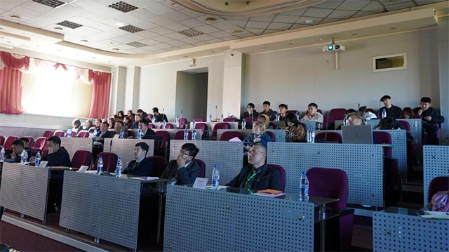 俄罗斯后贝加尔国立大学校长马尔腾诺科,黑龙江三江美术职业学院理事长、院长王英海教授,副院长金红炜教授在前排主席台就坐。会议由后贝加尔国立大学基础教育法和学前教育理论教研室副教授娜塔莉亚·希巴诺娃博士主持。
