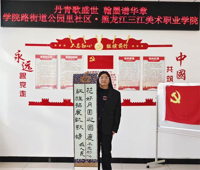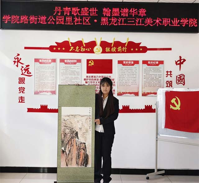 2024年9月26日,三江美院美术教育系师生受哈尔滨市学院路公园里社区邀请,参加“丹青歌盛世·翰墨谱华章”“庆祝新中国成立75周年”书画作品展活动。