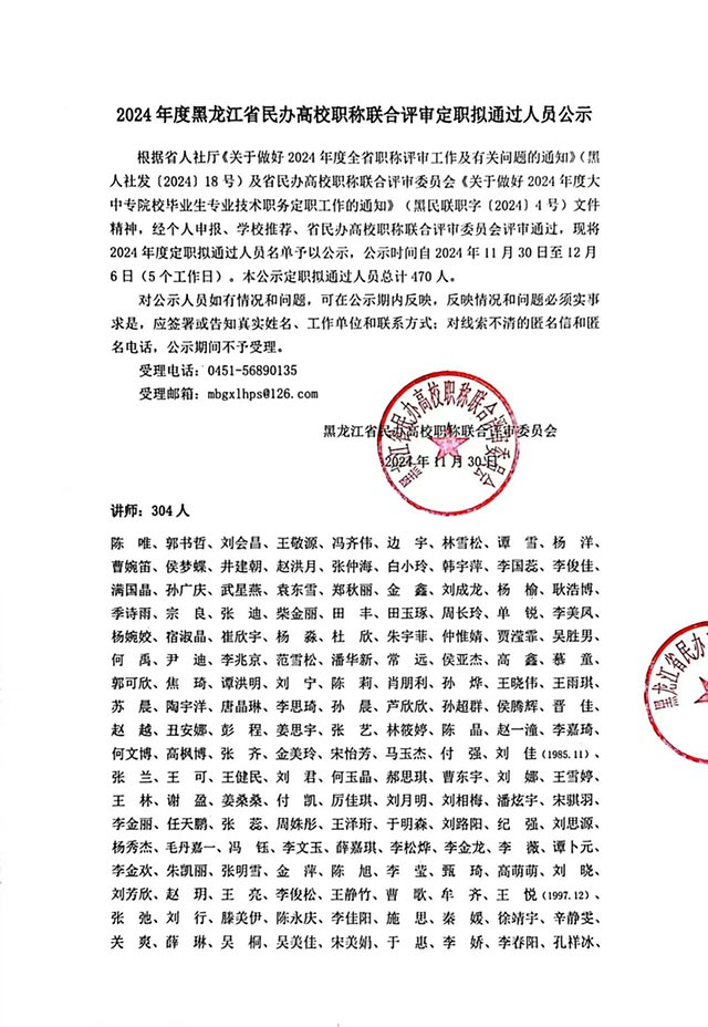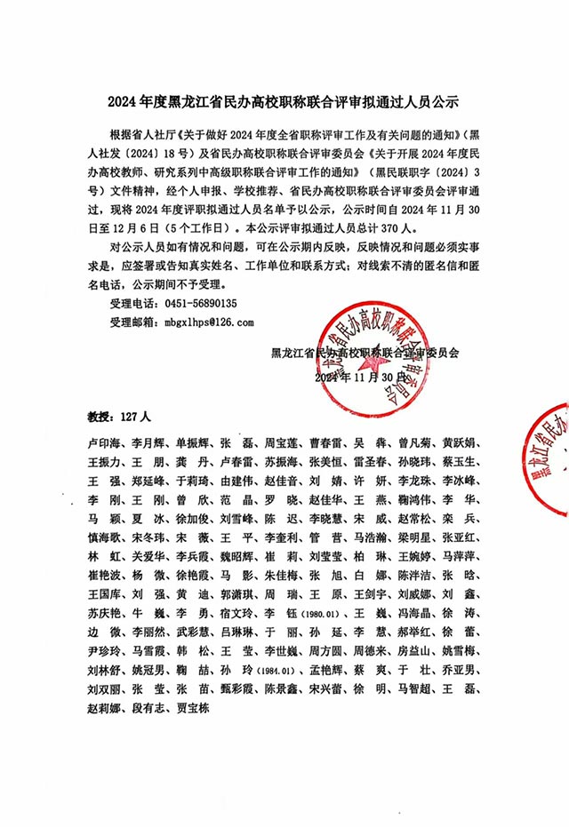 2024年度黑龙江省民办高校 职称联合评审结果公示