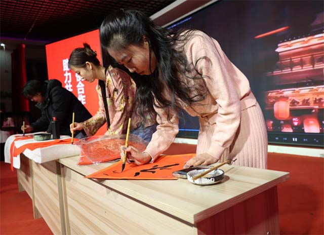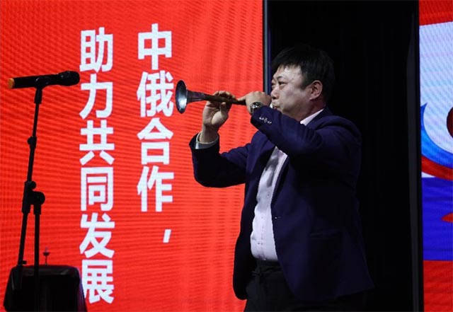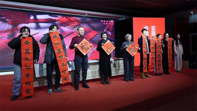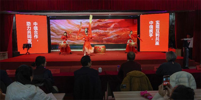 中俄联合教育学院伞宁、李瑛琪、彭湃三位教师带来的书法表演《福满中俄 春联寄情》,将满满的中国祝福送给俄罗斯客人。
