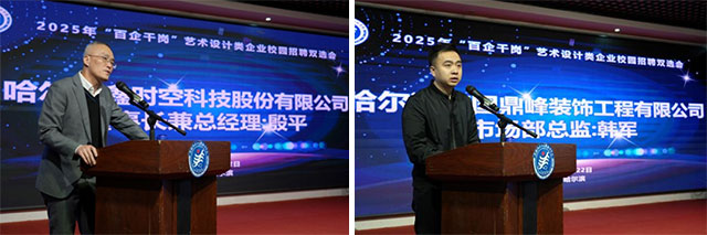 哈尔滨鑫时空科技股份有限公司董事长兼总经理殷平和哈尔滨南国鼎峰装饰工程有限公司市场部总监韩军代表参会企业代表先后作了发言。他们表示,三江美院在艺术设计领域具有较高的知名度和影响力,培养出的学生专业素养高、创新能力强。企业非常重视与三江美院的合作,愿意为学生提供广阔的发展空间和良好的工作环境。两位企业代表还介绍了公司的发展现状、业务范围、人才需求等情况,表达了与学院进一步深化合作的意愿,希望通过校企合作实现资源共享、优势互补,共同推动艺术设计行业的发展。