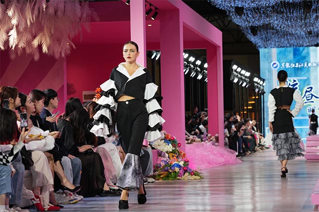 此次发布会上,学生们的作品让人眼前一亮。在结构设计方面,巧妙融合了传统中式元素与现代立体裁剪技术。有学生借鉴旗袍的立领与盘扣设计,结合现代修身剪裁,让服装既展现东方女性的婉约气质,又符合当下时尚审美与人体工程学,穿着舒适且行动自如;还有作品将汉服的宽袍大袖进行改良,运用抽褶、拼接等手法,使其更具层次感与灵动性,适应现代生活节奏。
