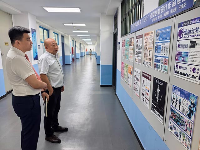 马鸿飞副书记来到师生作品展廊,认真观看学生艺术设计作品展览。在2023级8班李晓晓荣获工信部一等奖作品《化学领域成就完全用于造福人类》海报前,详细了解她的设计思路和该生的成长情况。