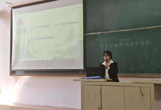 孙婷梅老师的“中华文明的传承与创新”,从中华文明发展史、中华文明的精神内核-价值观、天下观、秩序理想、中华传统美德的基本精神、中华文明与现代数字时代的融合等几个方面展开阐述。鼓励学生传承中华传统美德,深入挖掘中华传统文化蕴涵的思想观念、人文精神、道德规范,结合时代要求继承创新,让中华文化展现出永久魅力和时代风采。