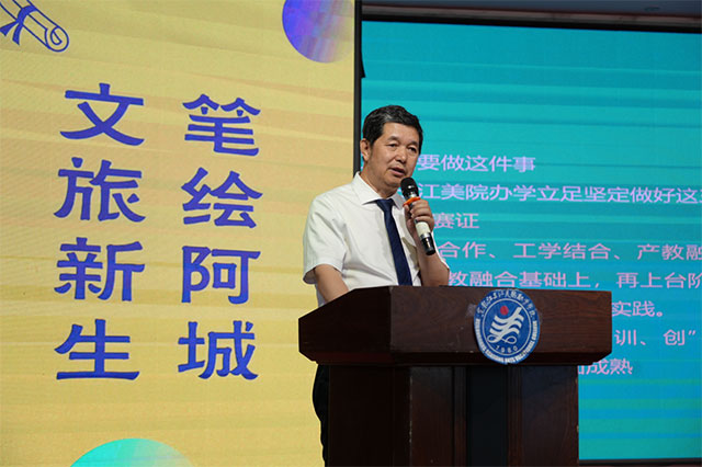 随后,学院教学督导室主任、本次活动文创组负责人、设计与科技融合学院教授吴志民,向大家报告了本次活动文创各组的文创情况。他介绍说:三江美院在传统产教融合基础上再上一个新台阶,发展成今天的“产教城”融合教学实践。学院的“产、学、研、训、创”一站式人才培养模式已经全面成熟,教学实践体系越来越符合社会经济文化发展需要。