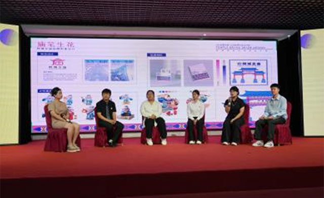 汇报会的高潮,是一场跨越代际、闪烁着思想火花的对话。这是汇报会的第四个环节,由李彤处长主持,中国美协会员曲士龙教授及本次活动评选出的四位优秀文创学生代表参加的现场座谈。问答中,曲教授的归纳评述了本次活动的意义,评价了印象深刻的完成作品。四位在项目中淬炼成钢的优秀学生代表——设计与科技融合学院的赵妍、孔一杨两名同学,艺术疗愈与人工智能学院的曲博文同学、数字影视动画工厂的黄婉晴同学。他们各自谈了自己文创工作的体会和感悟。