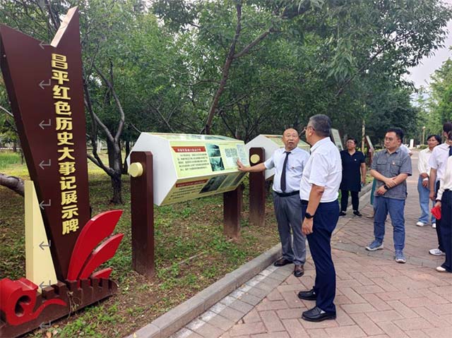 下午三点,党员们怀着崇敬的心情到达南口“红色印记园”。沿着参观路线缓缓前行,通过观看“南口会战”、“南口抗日武装斗争”、“昌平抗日根据地的斗争”、“八路军二克昌平城”、“抗日战争时期的南口”等多个专题栏目的图文介绍,党员们深入了解南口地区的光辉历程和英雄事迹。印记园陈列的多块浮雕以艺术化手法呈现的革命精神风貌,以及多幅先烈图片和文字述说的抗战故事,如一幕幕影片一一放映,重现那个战火纷飞、激情燃烧的岁月。历史的光影与下午的阳光重叠,红色精神仿佛穿透时空震撼心灵。