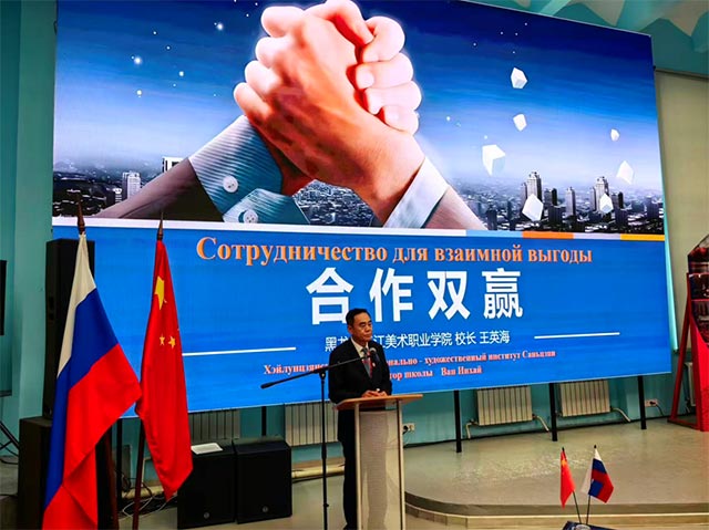 应中俄职业教育发展论坛邀请,我校理事长、校长王英海教授以"合作共赢”为题,在大会上做了演讲报告,在以大幅图片为背景和中俄文字提示下,简明扼要地介绍了我校与俄罗斯后贝加尔国立大学近年来在合作办学方面的进展和两校深入开展多项学术交流活动中所取得的成功经验,王英海校长在分亨经验的过程中,阐述了中俄两校在俄方共同建设"设计与科技产业学院”的务实举措,特别强调了中俄合作共赢是持续深化合作的重要原则,而培养更多具备国际视野和实际工作能力的高素质人才则是中俄教育合作共同的追求方向。王英海校长运用中俄图文PPT所进行的精采演讲,得到了中俄双方与会者的共呜和热烈的掌声。