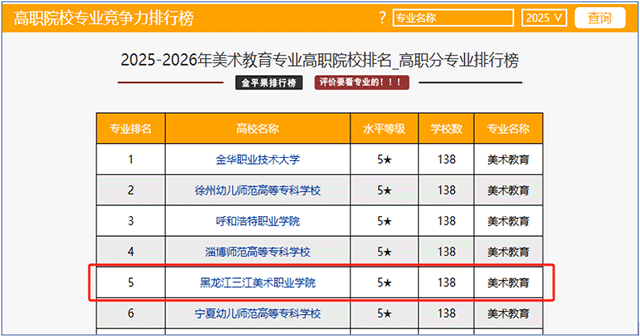 近日,金平果·中国高等职业院校专业竞争力排行榜正式揭晓,黑龙江三江美术职业学院多个专业表现卓越,再次荣膺黑龙江省第一名,全国排名持续跃升,充分彰显了学校在美术教育、艺术设计与科技、影视动画、智慧建筑工程等领域的领先实力与丰硕育人成果,生动诠释了学校“服务企业、服务社会、服务区域经济发展,培养能为用人单位创造价值的成品人才”的卓越成效。