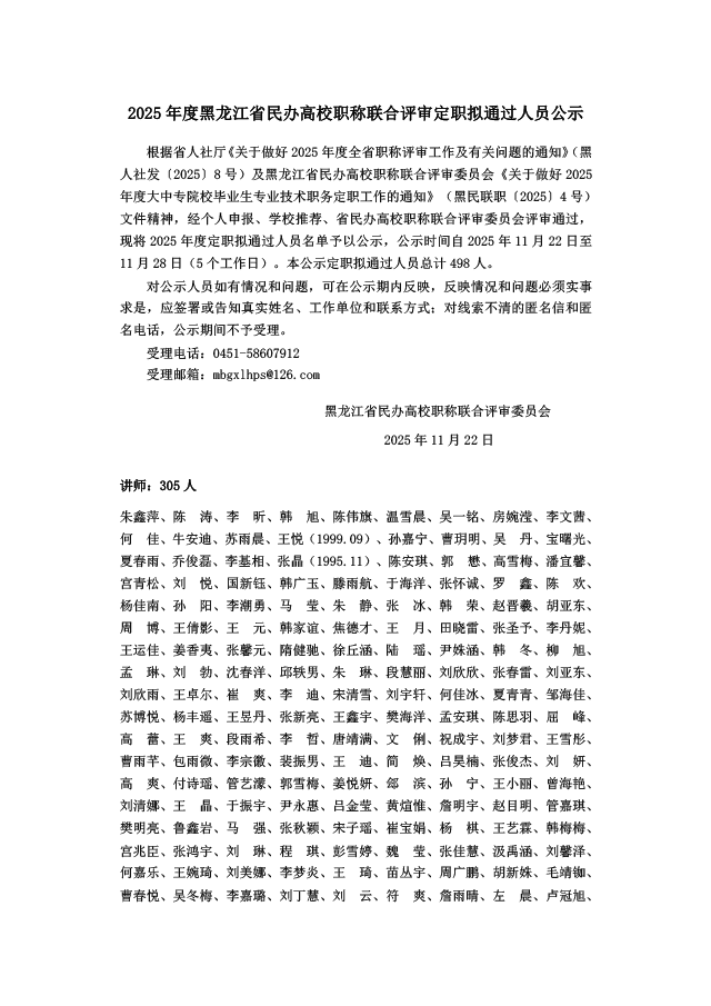 2025年度黑龙江省民办高校 职称联合评审定职拟通过人员公示