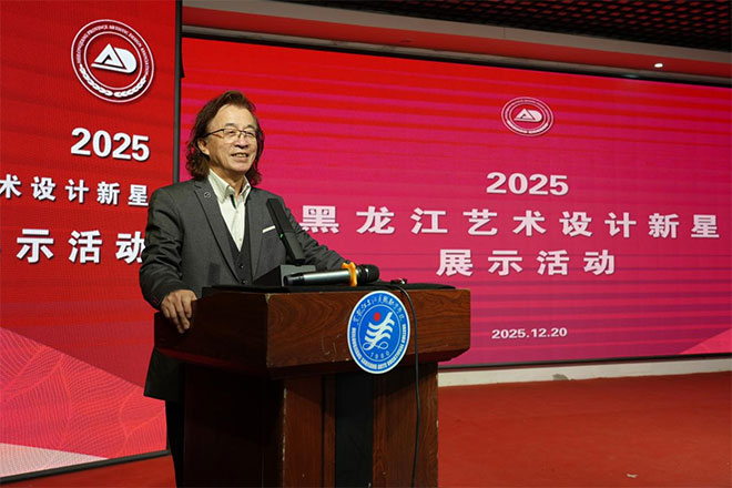 随后,张震甫会长代表主办单位致辞。他对黑龙江三江美术职业学院承办本次展览给予充分肯定。他指出,青年群体是我省设计创新的生力军,应当在专业教育、行业指导和创新实践中获得更多支持。省艺术设计协会将持续整合行业资源,为青年设计人才搭建展示、交流、成长的优质平台,让“新星奖”成为引领龙江青年设计风向标的重要品牌。