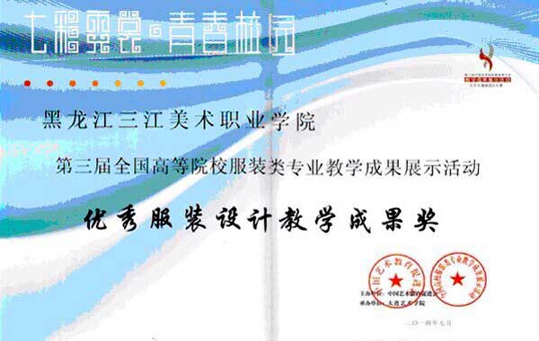 第三届全国高等院校服装类专业教学成果展示活动暨大学生服装设计大赛历时三天的激烈角逐,终于在2014年7月3日在大连艺术学院举行颁奖晚会上决出胜负。黑龙江三江美术职业学院大连教学实习基地的服装设计专业二年级学生王园园、肖玉琪两位同学服装设计参赛作品《墨》获得优秀奖;贾文斌、柳力巍两位老师获得优秀教师指导奖;黑龙江三江美术职业学院获得优秀服装设计教学成果奖项。