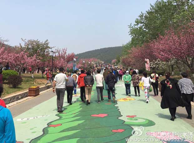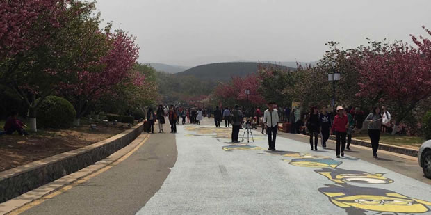 203景区樱花园占地近50万平米,拥有三千多棵樱花树,5万多平绿化地,是目前国内外规模最大、樱花树最多、品种最全的樱花园。