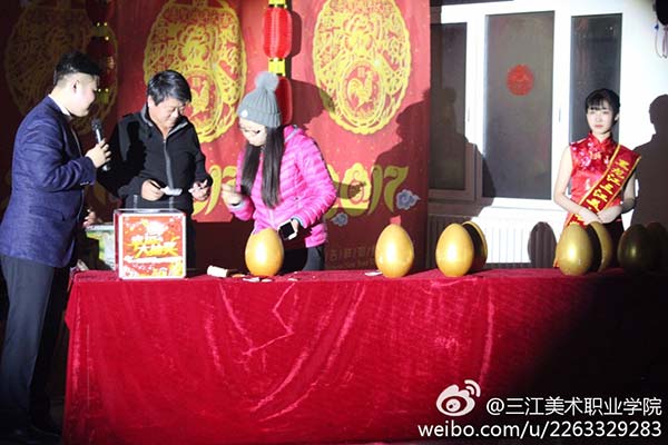 值得一提的还有“幸运砸金蛋”环节。每三个节目中间穿插一次砸金蛋活动,由学院相应领导抽取中奖编号,以入场卷编号做为兑奖凭证,被抽到的同学有一次上台砸金蛋的机会,金蛋内有相应的奖品;被抽到的同学感觉非常幸运,增强了晚会的互动性和娱乐性。