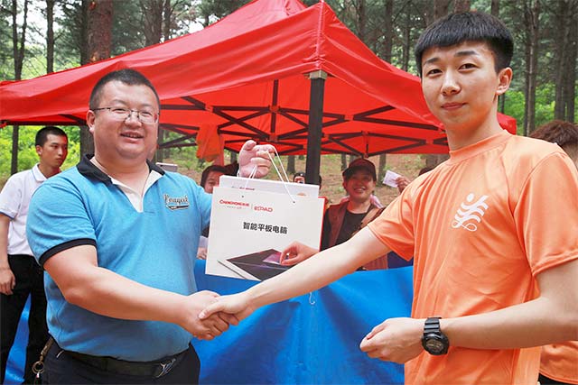 8:30分,队员们准时集合,向美丽的大来风景区出发,一路欢声笑语。经过美丽的达勒花海,伴着醉人的浓郁花香,队员们来到了森林氧吧,开始了“急速登顶”,队员们相互鼓励,奋勇向前,登上胜利的山顶,根据团队的协作与登山排名,获得了不同的奖励。经过这场体力的较量,就到了激动人心的寻宝时刻,大家在散落着宝物纸条的山上仔细的搜寻着,“我找到了!”、“我的是MP3!”随处可以听见队员们欢呼雀跃的声音,特等奖平板电脑最终花落橙队,队员们拿着自己的奖品爱不释手。