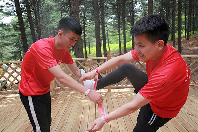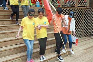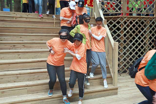 俗话说“上山容易,下山难”,这个项目,一半的同学眼睛蒙上眼罩,在搭档的引领下前行,完全将自己的生命交到了同伴的手上。当然,这些朝夕相处的兄弟姐妹们自然不会辜负对方的信任,齐心协力,在经历“风雨人生路”后, 所有选手都毫发无损地回到了山脚下。