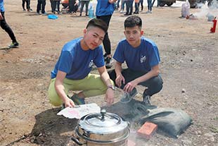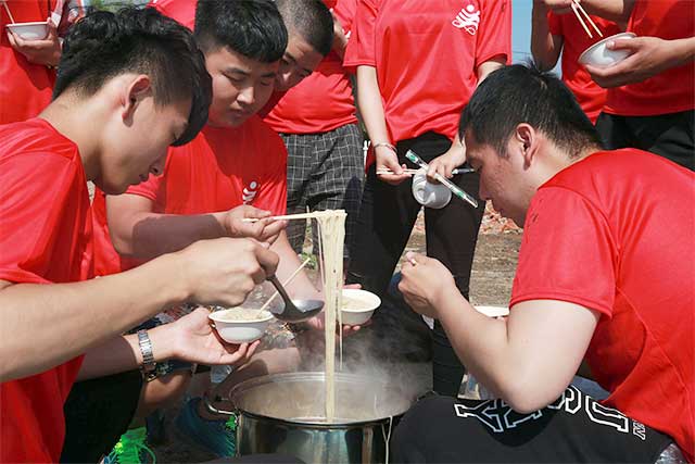 夏至将至,炙热强光的正午,离开喧嚣的都市,到野外埋锅造饭,对于在父母庇护下成长的队员们来说,这可是一次全新的体验,可队员们仿佛都是“行家里手”有的负责搭建炉灶,有的负责寻找木柴,有的负责煮水下面,有的负责“煽风点火”,一个个忙乎的不亦乐乎。饭终于做好了,众人拿起碗筷,蹲在地上开始吃了起来。