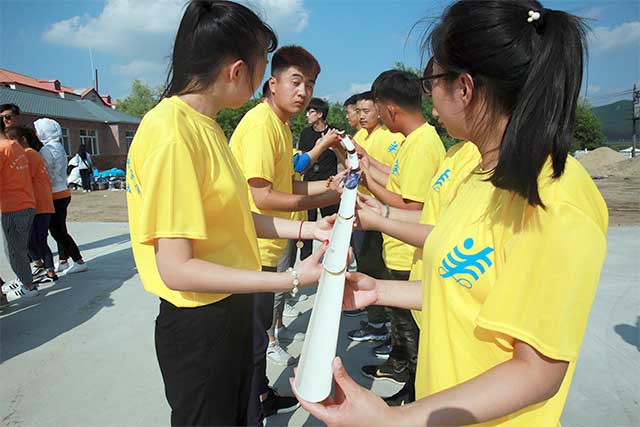 享受过“美味”之后,队员们稍做休息,开始了下一项活动--能量传递, 在球不能半途落地的前提下,队员们站成一排,利用手中半圆形胶管,把乒乓球滚动至尾部纸杯内,通过队员们相互配合,通过互相鼓励,五支队伍先后完成了任务。
