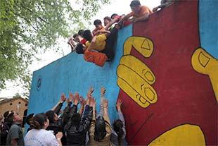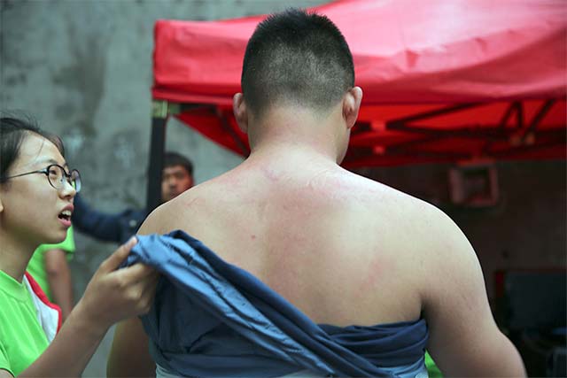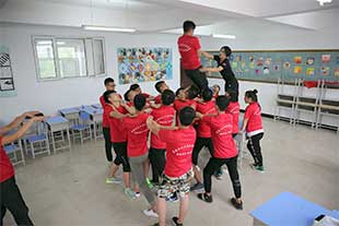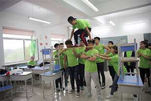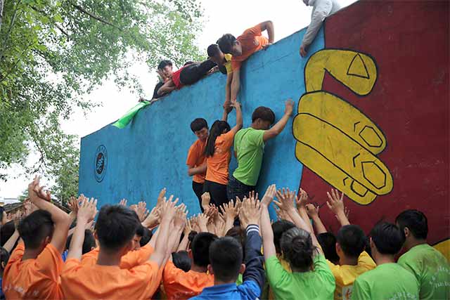 接下来,队员们集合在3米多高的毕业墙下,为了一个共同目标--爬过毕业墙,都竭尽全力,相互关心和爱护,当成功时,大家享受着成功的喜悦,当教练揭开人梯者的衣服时,看到人梯者的肩膀上留下了的被踩踏的痕迹,有很多女生默默的留下了眼泪。