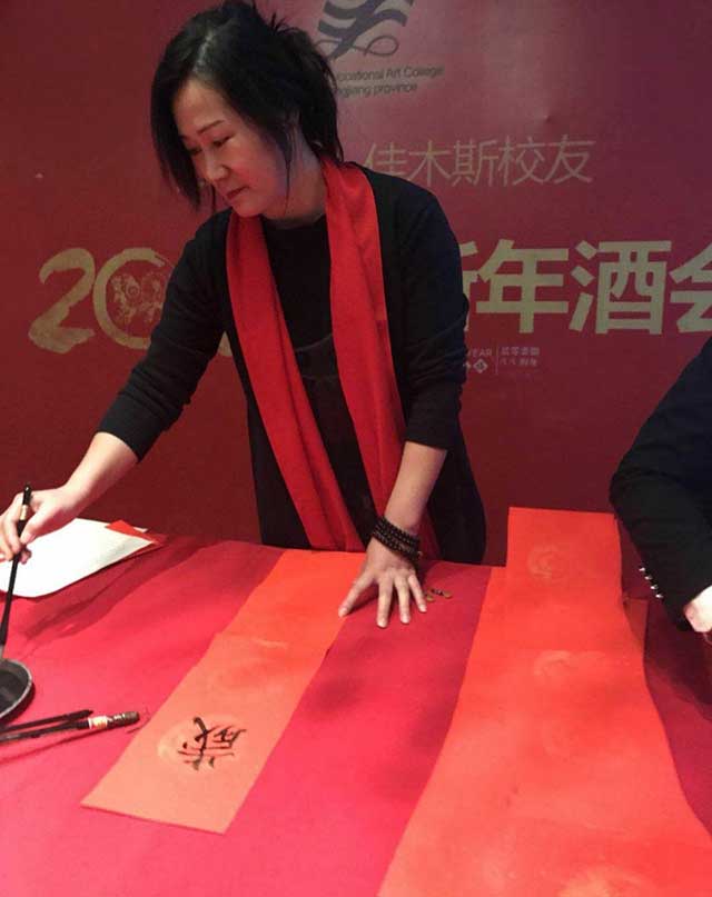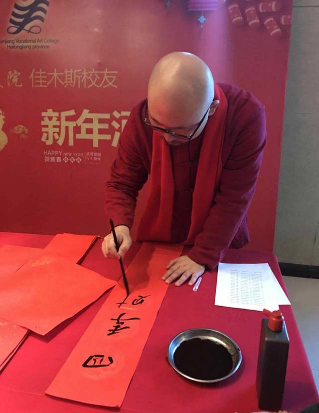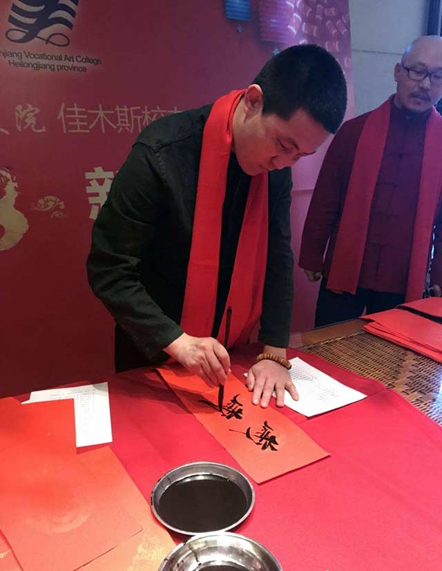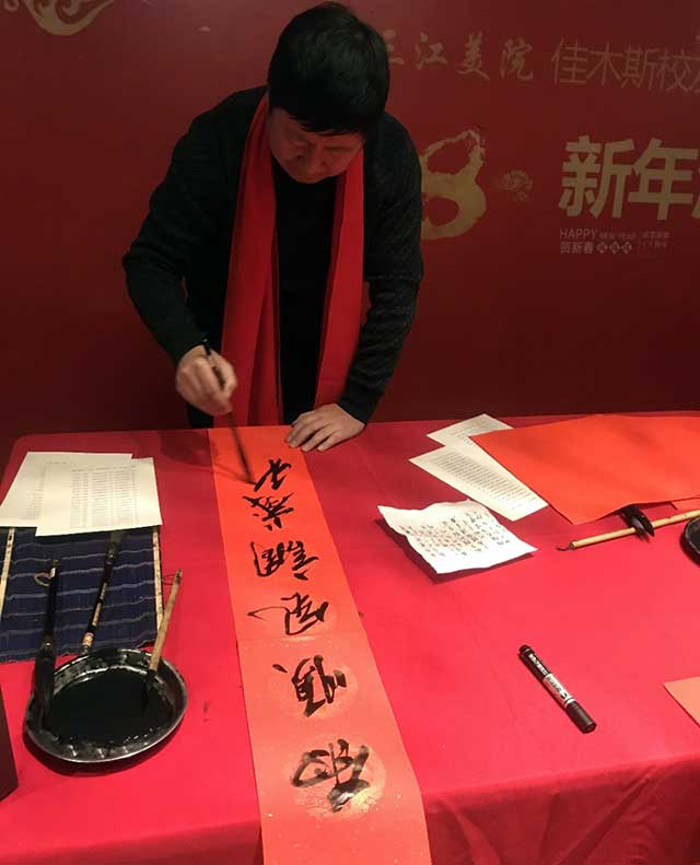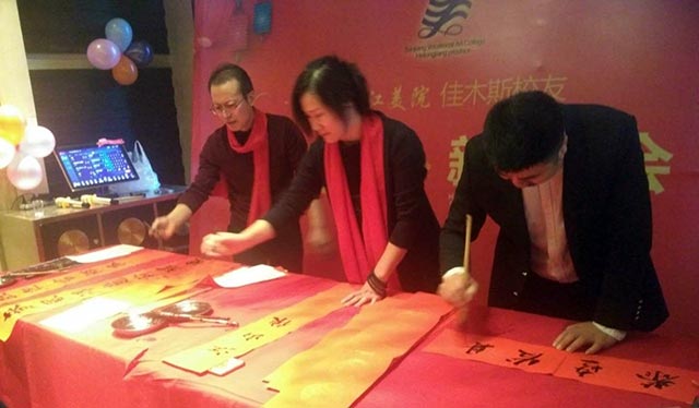 三江美院综合艺术专业89届毕业生、佳木斯大学商学院教师李树亮,93届毕业生、远航书画培训学校校长高战及夫人,86届综合美术班毕业生、国画家姚宝山,室内设计专业97届毕业生、佳木斯龙江装饰工程有限公司总经理季龙江,装潢艺术设计专业89届毕业生、哈尔滨剑桥学院教育学院副院长马世伟等校友除了在美术教育、艺术设计等领域有所建树、功成名就之外,在佳木斯市乃至全省书法届也都是声名赫赫的人物。他们也纷纷拿起毛笔,投入到春联的创作之中,同时也表达了对培养他们成长、成才的母校——三江美院的恩师的无限感激之情。