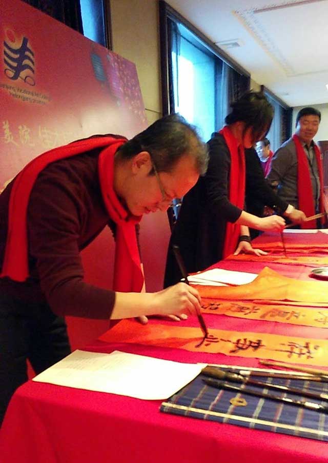 陈绍禹是三江美院装潢系广告专业97届1班毕业生,现为中国书法家协会会员,在国内书法界颇有名气。受到刘耕等校友的感染,他也脱去外套,捉起一支毛笔,龙飞凤舞一番,一幅精美大气、功力深厚的书法作品就呈现在人们的面前。他写的上联是:“岁通盛世家家富”,下联是:“人遇华年个个欢”。横批是:“皆大欢喜”。