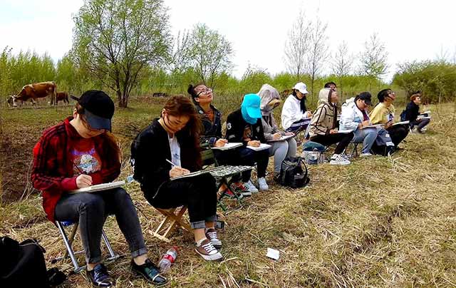 一周后,我们在姚教授那里接着学习国画。每天都有必备的理论讲解和实践操作环节。我们学会了画猴子、兔子、金鱼、虾、鲤鱼,还学习了梅兰竹菊四君子的画法,分析四君子的特点并教我们怎么画好四君子。我们每一天收获都很多、很充实。最后一天我们去四丰山写生,画树木。写生的每一天都很开心。在江边我们遇到一个小美女也对画画很感兴趣,赵爽老师让我教小美女画小白兔,感谢赵老师给我这次实战机会,还有很多不足的地方,回学校在教学实践课堂中我也会注意并改正。