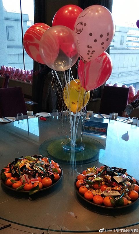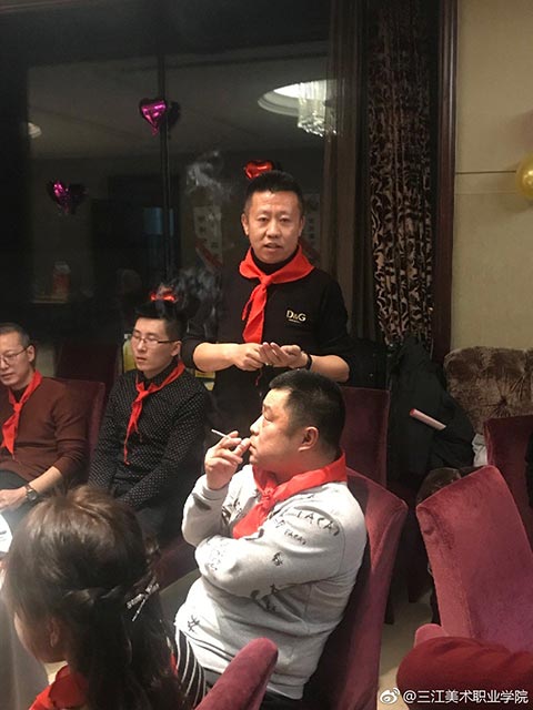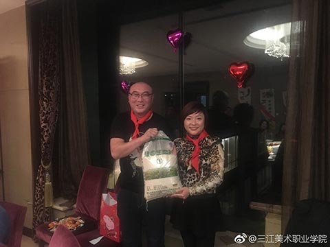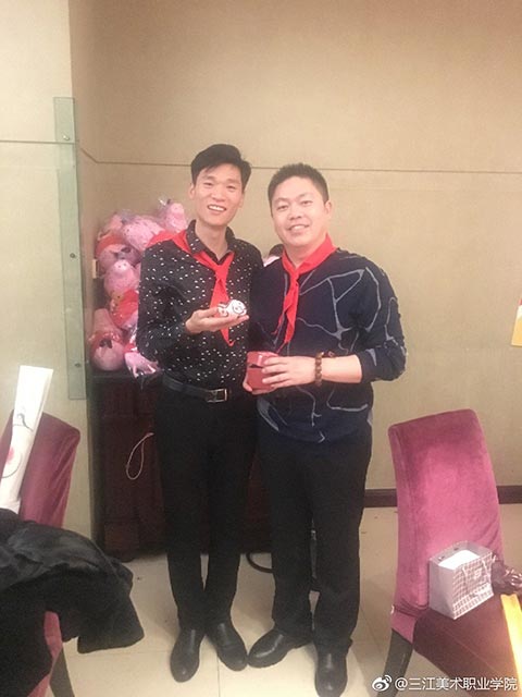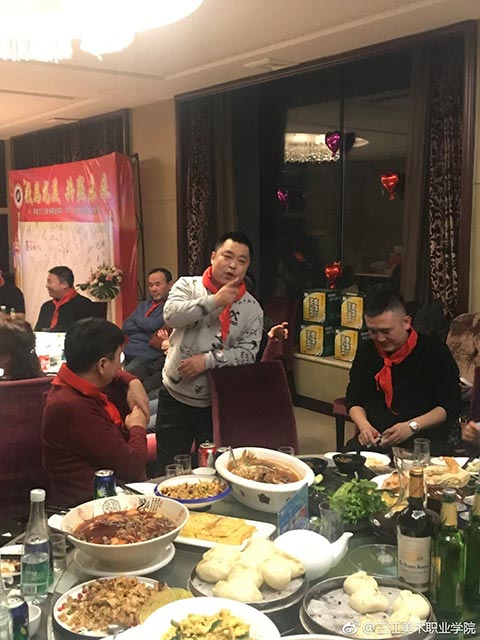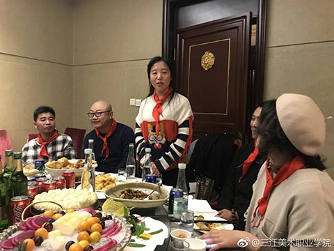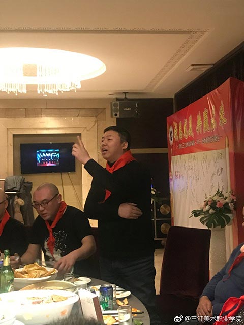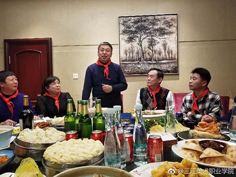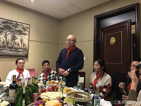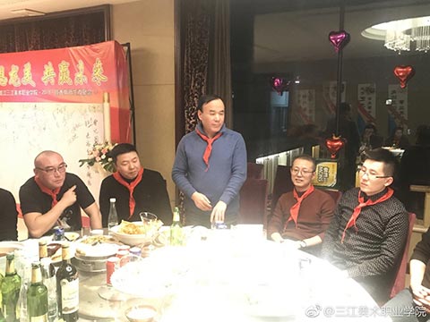 晚宴开始了,大家簇拥着王英海院长和王少青书记,分两大桌落座。今年年会活动总指挥姚宝山老师宣布年会晚宴开始后,院长王英海首先发表了热情洋溢的新春致辞。他对年会的筹备工作给予了充分的肯定,对与会者能够到来表示了热烈的欢迎。校友相逢情义重,才子佳人开心聊。与会者逐一进行了自我介绍,简述了自己的职业生涯,表达了对母校——三江美院的感恩之情。这个环节很重要,大家对彼此的事业有了充分的了解,才能真正做到资源共享,共赢未来!