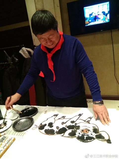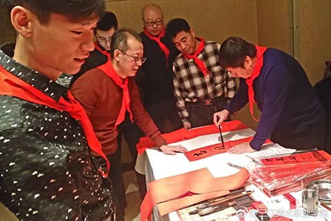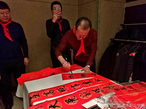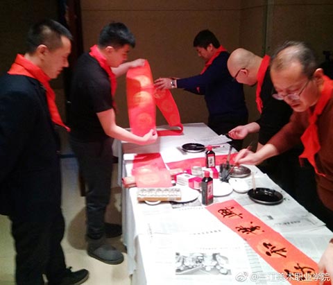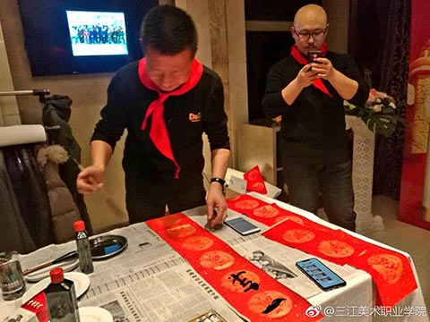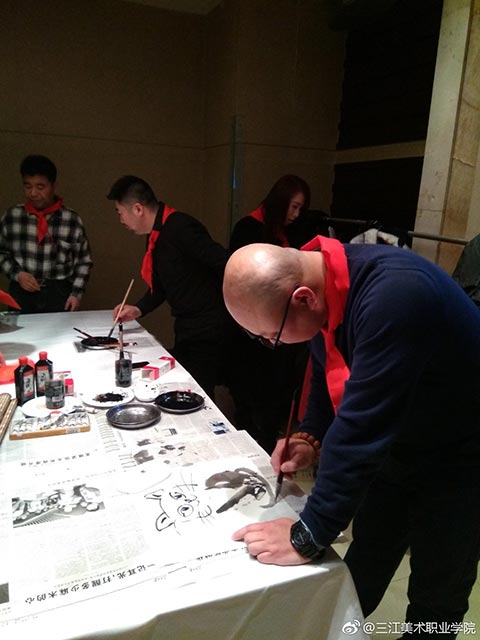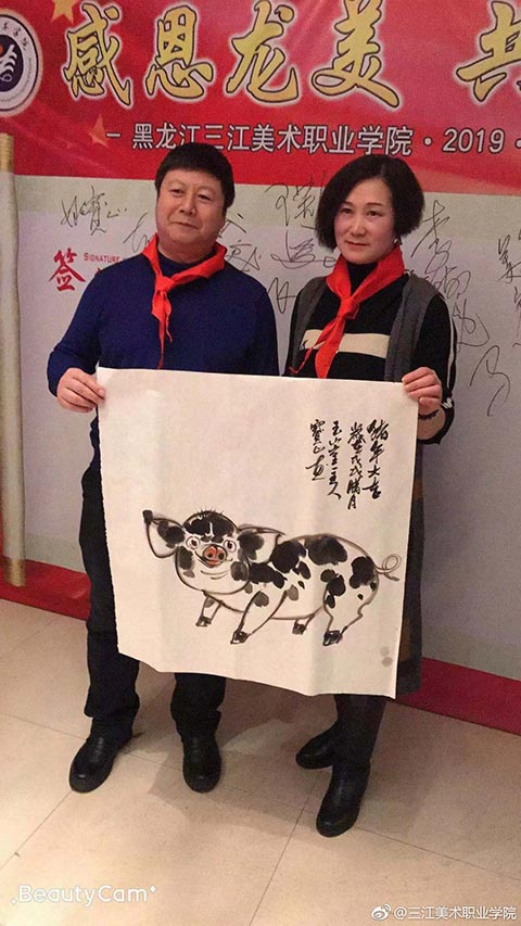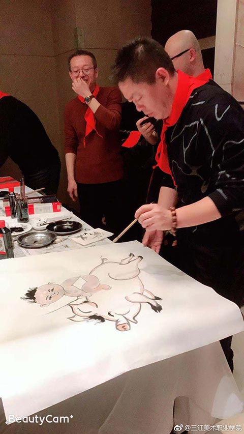 王英海院长和王少青书记签完名后,年会开始了!第一个环节是“书画笔会”。你写春联,他画福猪,美院校友聚会,最不缺的就是能写绘画的!只是一会儿功夫,“福”字书法作品便铺满了走廊,福猪绘画作品则是你夺我抢!