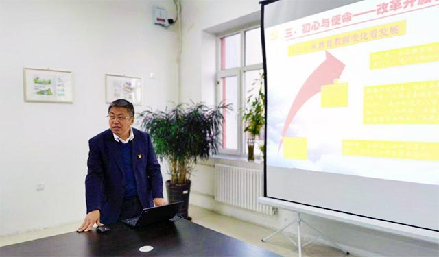 王少青书记以牢记“枪林弹雨办教育、一穷二白办教育回首”为主题,从深刻领会习近平新时代中国特色社会主义思想重大深远意义;深入践行“不忘初心、牢记使命”主题教育活动;牢记“初心使命”,推动区域性高水平高职院校建设进程几个方面,与大家一起交流了学习的体会与收获以及学用结合的一些思考。