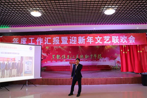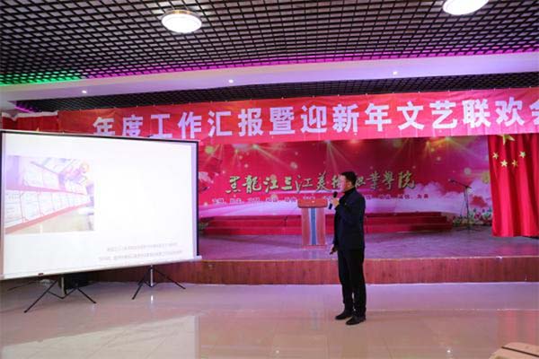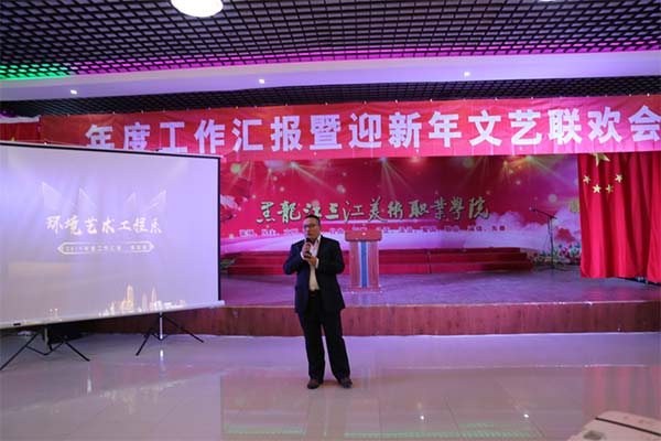 各系(院)年度工作汇报后,学院理事会理事长、院长王英海教授发表了重要讲话。他代表学院理事会和学院领导班子,向全院广大教职工和全体学生表示亲切的慰问!他说:“一年多来,我们黑龙江三江美术职业学院的各项工作,在学院领导班子的坚强领导下,在学院全体教职工和各类学生社团的共同努力下,取得了优异的成绩,成为我们学院各项工作中的一道道亮丽的风景线。”王英海院长说,我院在教育部全国职业院校艺术设计类作品“广交会”同步交易暨2019年校企创新成果对接会上,三江美术职业学院作为东北三省唯一一家高校代表参会。在平面视觉类、产品设计类、环境艺术类、工艺美术类、动漫数字类和服饰服装类等各大类项目均有作品参展并获奖。同学们创作的作品设计精美、风格大气、形式多样,充分体现了黑龙江省地理与气候环境的独特优势和淳朴的人文风貌,收到了专家评委们的一致好评。王英海院长还一一例举了各个系(院)在过去的一年里所做出的成绩,对每一个系(院)的工作都给与了充分的肯定,还介绍了我院美好的升学及就业前景。最后王英海院长祝福大家新的一年学习成绩有突破,综合素质多提升,并叮嘱同学们在寒假期间注意安全,在家多为父母分担事务,祝大家新年快乐。简短的话语,深情的嘱托,蕴含着无尽的希望,沁入每一位三江美术职业学院教师和学子的心田。