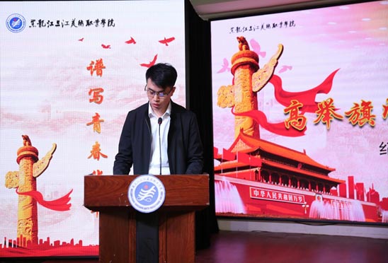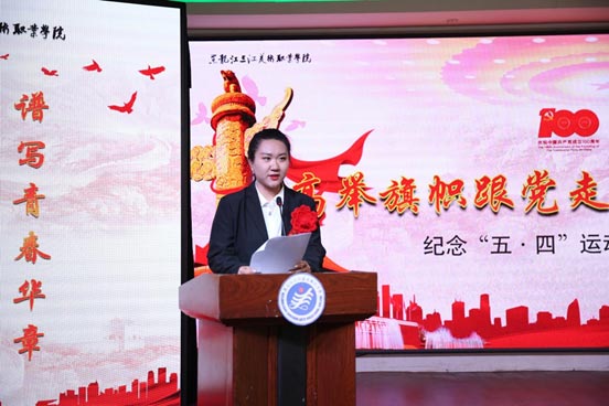 代表教师发言的是学院美术教育系党支部书记、黑龙江省青年书法家朱振宇老师。他在发言中鼓励大家说:“作为青年教师,我们要在三江美院这个平台上尽情展示自己的激情和才华,用求实和崇真献身我们的教育事业,推动学院的发展!让我们在五四精神的指引下,发挥青年人的智慧,乘风破浪,与时俱进,拼搏创新,为我院“十四·五”新时期大繁荣大发展贡献力量!”