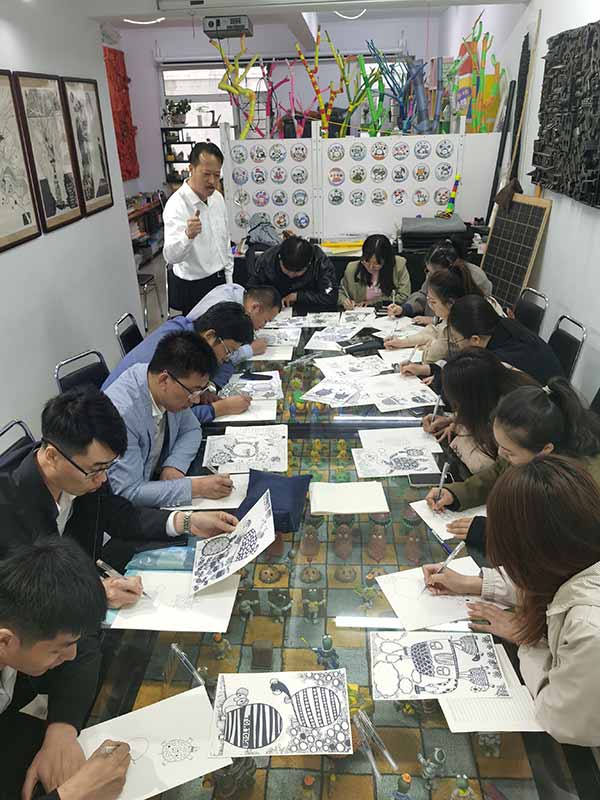 教师们来到翰林书画苑,一进门便被杜平教授的热情以及书画苑内的精美环境创作所深深吸引。书画苑内的热情分享与窗外的小雨相得益彰。美术教育系的教师们对翰林书画苑进行了参观。随后,杜平教授就少儿美育教学理念、教学经验、案例分析、个人感悟等几个方面与美术教育系全体同仁进行了深入的交流与探讨。