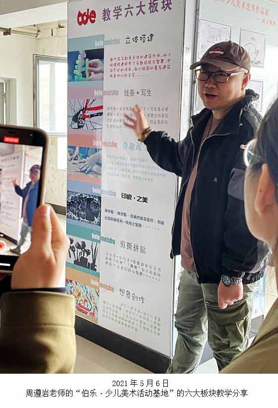 到周遵岩老师的“伯乐·少儿美术活动基地” 参观研学,周老师的教学分享让我受益匪浅。在参观各个校区过程中,也体会到了教学理念、环境的重要性。引用一位名人蒙台梭利的话来说,“必须注意为儿童期设置一个适当的世界和一个适当的环境,这是一个绝对迫切的需要。”只有给儿童准备一个适宜的环境,才能开创一个教育的新纪元。在教学理念上,要尊重和保护每一个孩子的“童趣”,我们培养的不是“画匠”,我们培养的是有思想,有创意,有眼界,有态度、有自己风格的学生。在幼儿创意美术教学中,我们要注重孩子的绘画过程,关注孩子在绘画过程中的细节,不要过于在乎绘画结果。尊重孩子的想象、表现力,在绘画过程中让孩子有自由选择的权力,有与朋友轻声交流的机会和绘画的时间,孩子可以灵活地运用创作材料,大胆地进行探索。让幼儿根据自己的意愿去创作,才能充分地发挥他们的创造潜能。