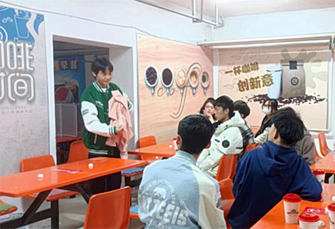 同学们开心愉悦地来到活动现场,每人一杯咖啡,共享午后美好时光。主持人介绍了举办“咖创屋”的目的和意义。首先发言的同学是影视动画与服装工程系学生,现在专升本国际学部三班学习的聊哲通同学,他今年上学期参加了全国职业院校技能大赛服装设计比赛。他拿着参赛的作品,一边讲述参赛过程,一边和同学们交流互动。服装设计是他最喜欢的专业,来到三江美院,和名师学习前沿技术,收获很大。遗憾的是,这次比赛他没有取得理想的成绩,但他表示,会总结经验和做法,鼓足劲头,为明年的比赛做好充分的准备,不辜负老师和同学们的殷切期望。