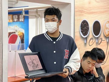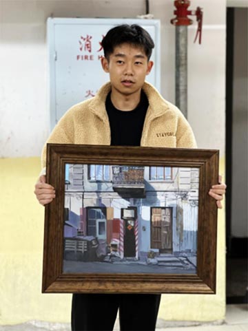 美教系学生管梓林展示他的作品《老房子》