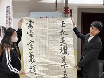 书法是中国传统文化中最具代表性的艺术表现形式。它依托于汉字,往往是以诗文为载体。古人的诗,是一个综合全息的形式,要么和吟诵歌曲结合,要么则与书法墨迹为一体。李春玉同学在讲述作品的主题时说:“我们是新时代的年轻人,一定能飞向长空摘月亮,也可以潜下海洋捉鱼或鳖。我们遇到困难时,一定要有自信;可以去战胜一切,中华儿女壮志凌云,世上无难事!”