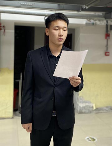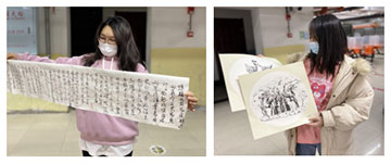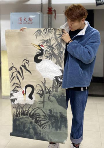 首先是来自美术教育系大二书画专业的张睿同学以一副国画《双鹤图》开场。这幅作品大气震撼,他画了一周的时间,并阐述了他的创作思考。鹤,它那一尘不染的洁白羽毛、秀丽挺拔的体态、华美优雅的舞姿,洋溢着一种神圣而高贵的氛围,自古以来不仅被人们视为敬慕崇仰的灵物祥瑞,更成为中国人审美意识的一个重要象征。他要把这种吉祥的寓意用他的国画技法给表达出来。