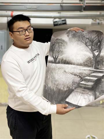 影视动画系的降盛凯同学带来的一副风景素描作品《光》,这幅作品的创作源于十一期间的外出写生。他阐述说:在选景的时候这一缕阳光直射,吸引了我,它不仅在深秋中给我带来了温暖,也在心里给我一种豁然开朗的感觉。金色的光像人性里的一种光芒!绚烂、温暖,对我是一种指引。如何将这种对光的向往指引内心,以一种更博大的情怀与之共存?通过这道光体现出来,这是我描绘这幅画的重点。
