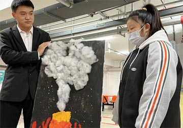 2021级美术教育系的学生贾平同学带来的作品是《火山喷发》。这幅作品的灵感来自学生的梦境,整幅画的大部分以棉絮来体现火山的浓烟,在黑色的背景衬托之下,让画面更有冲击力,表现出作者对生命的重视和敬畏。