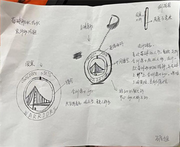 环艺系同学马佳旭的作品展示名为《装饰挂件》。马佳旭同学的装饰挂件整体大logo以金州勇士为主体,边缘为镂空的设计,大外圈用铁环链接里面的金州勇士logo。增添了观赏性、创意性。马佳旭同学的设计理念更贴合大众。