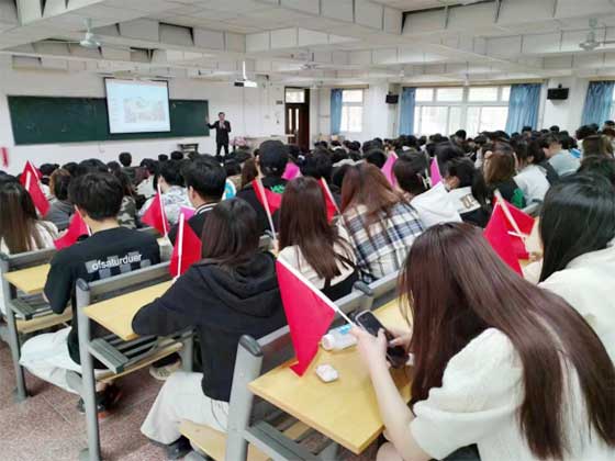 下午12点50分,多媒体报告厅内人头攒动,座无虚席。来自北京教学实习基地的全体大一新生每人手里拿着一面小红旗,精神抖擞地坐在课桌前,准备聆听三江美院创办者、法定代表人、知名教育管理专家王英海教授的专题报告。