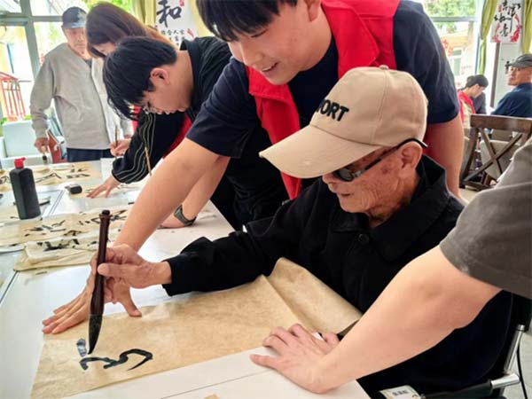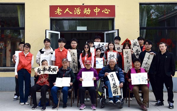 活动最后,学生志愿者们将自己创作的绘画和书法作品送给老人们,并和老人们一起合影留念。