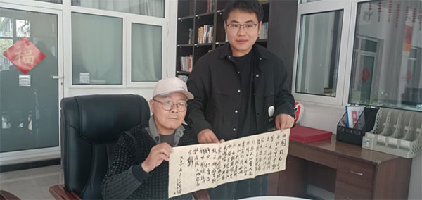 2023级2班的熊明灿同学指导老人创作书法作品《沁园春·雪》,老人有一定的书法功底,看得出老人很喜欢自己写的这幅书法作品,老人表示自己要带走收藏。