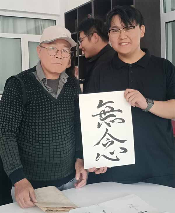 2023级4班玉卓腾同学将自己写的《无念》书法作品送给老人。