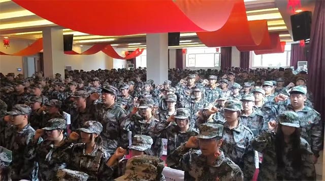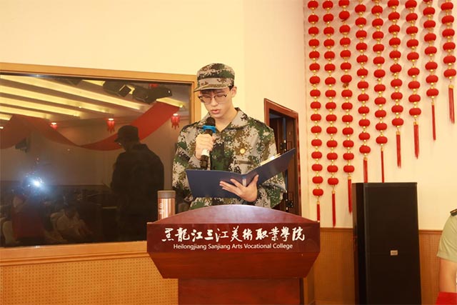 在军训团团长徐东洋的带领下,面对鲜艳的军训团旗,全体新训学生举起右手庄严宣誓:“我是龙美学子,我谨遵校训:‘重实践、讲效益、求质量、攀高峰’。听从指挥,遵守纪律,刻苦训练,顽强拼搏。不负亲人期盼,不负恩师教诲,不负青春时光,用最优异的成绩为父母争光,为美院添彩!”