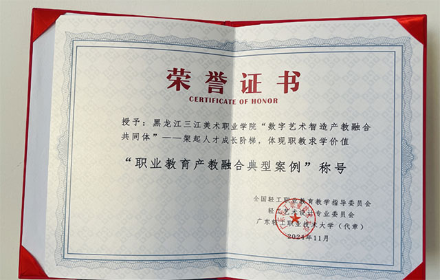 黑龙江三江美术职业学院在本次职博会上成为全国数智艺术与设计创意行业产教融合共同体成员单位,同时也获得了“职业教育产教融合典型案例”的荣誉称号。