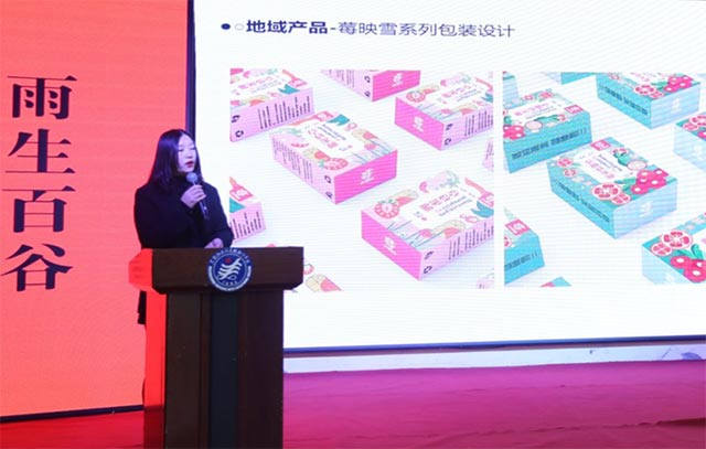 首先登台亮相的是地域品牌设计组的指导教师王爱君。她以创新的设计和深情的讲述,将团队精心打造的六件作品逐一呈现给在场的每一个人。这些作品不仅体现出龙江地域品牌的文化底蕴,更以哈尔滨经典童年零食糖葫芦为灵感,巧妙设计出了糖葫芦造型的小烧酒瓶。这一设计不仅唤醒了人们对儿时记忆的深情回望,更赋予了设计以独特的趣味与韵味。