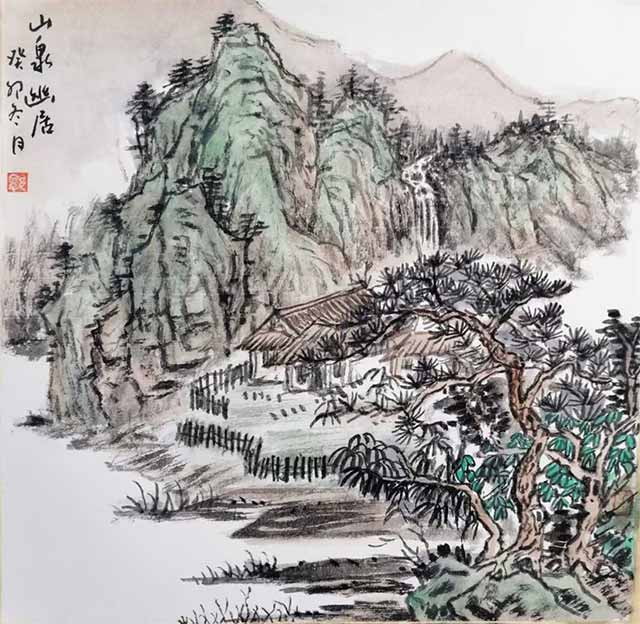 ▲学生郭庭伽创作的山水画作品《山泉幽居》