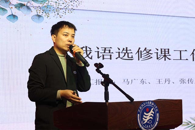 ▲俄语选修工作室负责人马广东在汇报