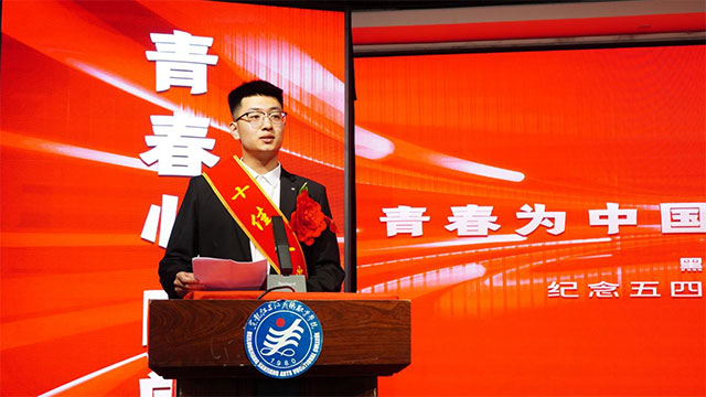 美术教育系学生王泰森作为“十佳大学生”代表发言,他以“海浪相依”作为比喻分享了自己的成长经历:专业上,他深耕书法传统文脉,融合鱼皮画与剪纸技艺传承非遗,作为首批赴俄交流生促进中俄艺术交融;在学生工作中,他创新班级管理模式,举办多样文体活动,丰富第二课堂;在社会实践中,深入哈尔滨特殊教育学校支教,用“翻转课堂”为特殊学生授课,还走进社区回馈社会。他呼吁龙美学子要牢记校训,在时代浪潮中绘就青春答卷。